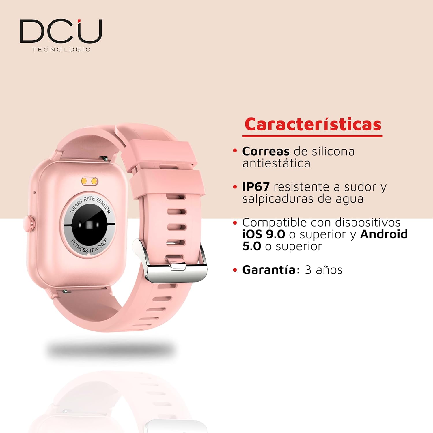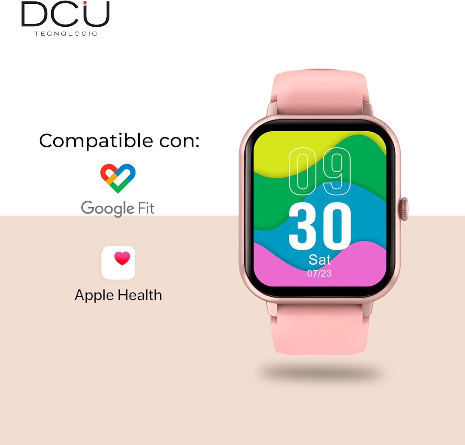 DCU 34157027 Reloj inteligente con pantalla táctil de 1,83'' HD Con función de llamadas a través de bluetooth y agenda de hasta 8 contactos favoritos Correa de silicona antiestática de 19mm en color rosa Con monitor de frecuencia cardíaca, contador de pasos, kilómetros y calorías 123 modos de deporte. Incluye caminar, correr, ciclismo, yoga, saltar a cuerda, remo, spinning etc. Compatible con Apple Health y Google Fit Notificaciones de APP’s Pantalla personalizable (+ de 100 diseños prediseñados o fotos de tu galería) Resistente al agua IP67* Otras funciones: Asistente de voz 4 juegos Monitorización del sueño Monitor de presión arterial y oxígeno en sangre Control remoto para tomar fotografías Control del reproductor de música de tu smartphone Control del ciclo femenino Información meteorológica Alarma de sedentarismo y para beber agua Despertador Cronómetro Temporizador Modo no molestar Duración de la batería: 5-7 días en uso / 10-15 en standby (depende del uso la duración de la batería puede ser menor) Aplicación DaFit Compatible con dispositivos iOS 9.0 o superior y Android 5.0 o superior Especificaciones técnicas: Esfera del reloj: 42*35*0.9mm Resolución de pantalla 240*284 píxels Perímetro de la correa: longitud total 242mm Versión Bluetooth: 5.1 Batería: Li-ion polímero 230mAh Tiempo de carga completa: 2-3h Peso: 36gr. 27 idiomas disponibles: inglés, español, francés, alemán, coreano, ruso, árabe, ucraniano, italiano, portugués, japonés, chino, danés, etc. *IP67 -> sumergible hasta 1m durante un máximo de 30 min. en agua dulce (no utilizar en agua salada)